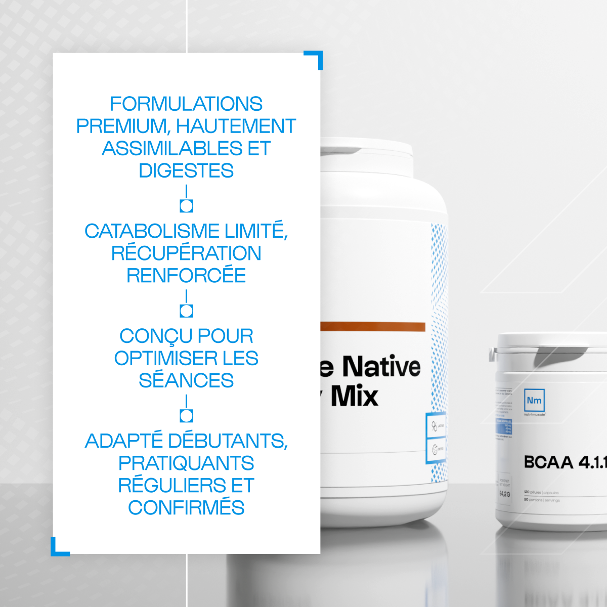 Nous respectons la norme Afnor et faisons également le choix de la transparence en indiquant l’ensemble des informations sur le produit, à savoir les fournisseurs, les certificats d'analyse, les aminogrammes complets et toutes informations complémentaires qui peuvent vous aider dans le choix de votre produit, mais aussi vous rassurer sur sa provenance.La fabrication de chacun de nos produits commence par la sélection rigoureuse des matières premières, que nous identifions pour leurs principes actifs répondant à des besoins de performance.