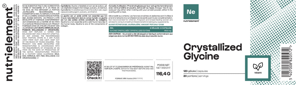 Nous vous recommandons d'associer la Glycine Cristallisée Nutrimuscle avec tous nos collagènes, le ZMP, le ZMB, le Citrate de Magnésium, la N-actéylglucosamine, la chondroïtine, la Créatine Créapure®, le Glutathion Setria®, le Lactium® Nutrimuscle.