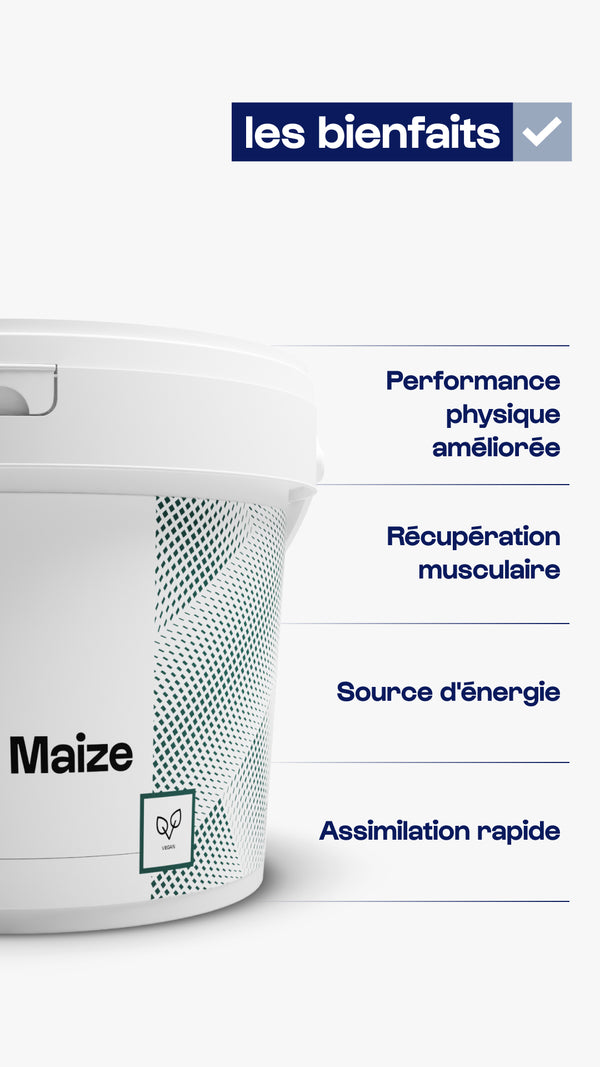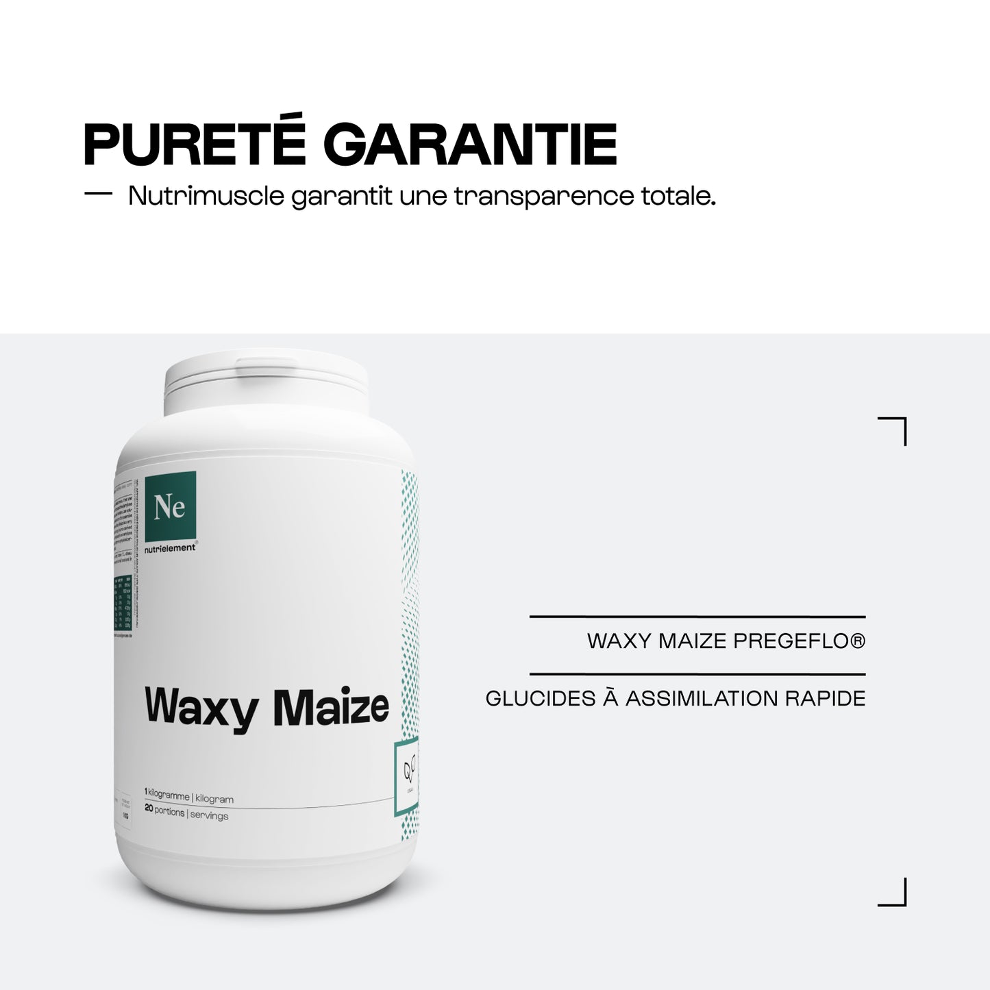 Le Waxy Maize Nutrimuscle est un glucide de masse moléculaire très élevée, issu de maïs cireux, c’est une source d'énergie issue de polymères de glucose ne contenant que de l'amylopectine (amylose < 1 %). L'amylopectine et l'amylose sont les deux composants principaux de l'amidon.